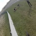 Eenmaal aangekomen bij een hoge muur van ongeveer 250 cm hoog met een brede rand vraag ik Jurre om een handje. Ik leun echter net te ver naar achter en ga onderuit. Niets aan de hand en weer opstaan ! De tweede poging is succesvol; althans dat lijkt zo. Ik zit op de rand van muur en wacht op Jurre. Later die dag zou hij aangeven dat hij mijn GoPro van dichtbij heeft gezien. Van heel dichtbij zelfs. Terwijl ik n.l. naar de rand van de muur reik, tikt mijn GoPro op volle snelheid de linker wenkbrauw van Jurre aan. Gelukkig geen bloedige taferelen, maar wel een dikke wenkbrauw en een levenslange hekel aan GoPro’s. De GoPro heeft alles uiteraard haarfijn gefilmd. Zie onderstaande video: